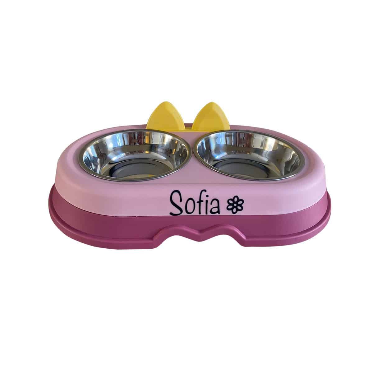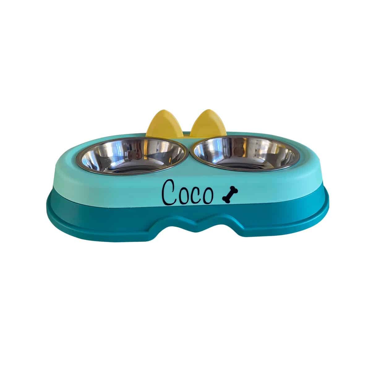 comedero y bebedero con platos de acero inoxidable. Medidas producto : 21 x 37 ancho x 8cm Material: Cubierto de plástico y platos de acero inoxidable. Con gomas Antideslizante